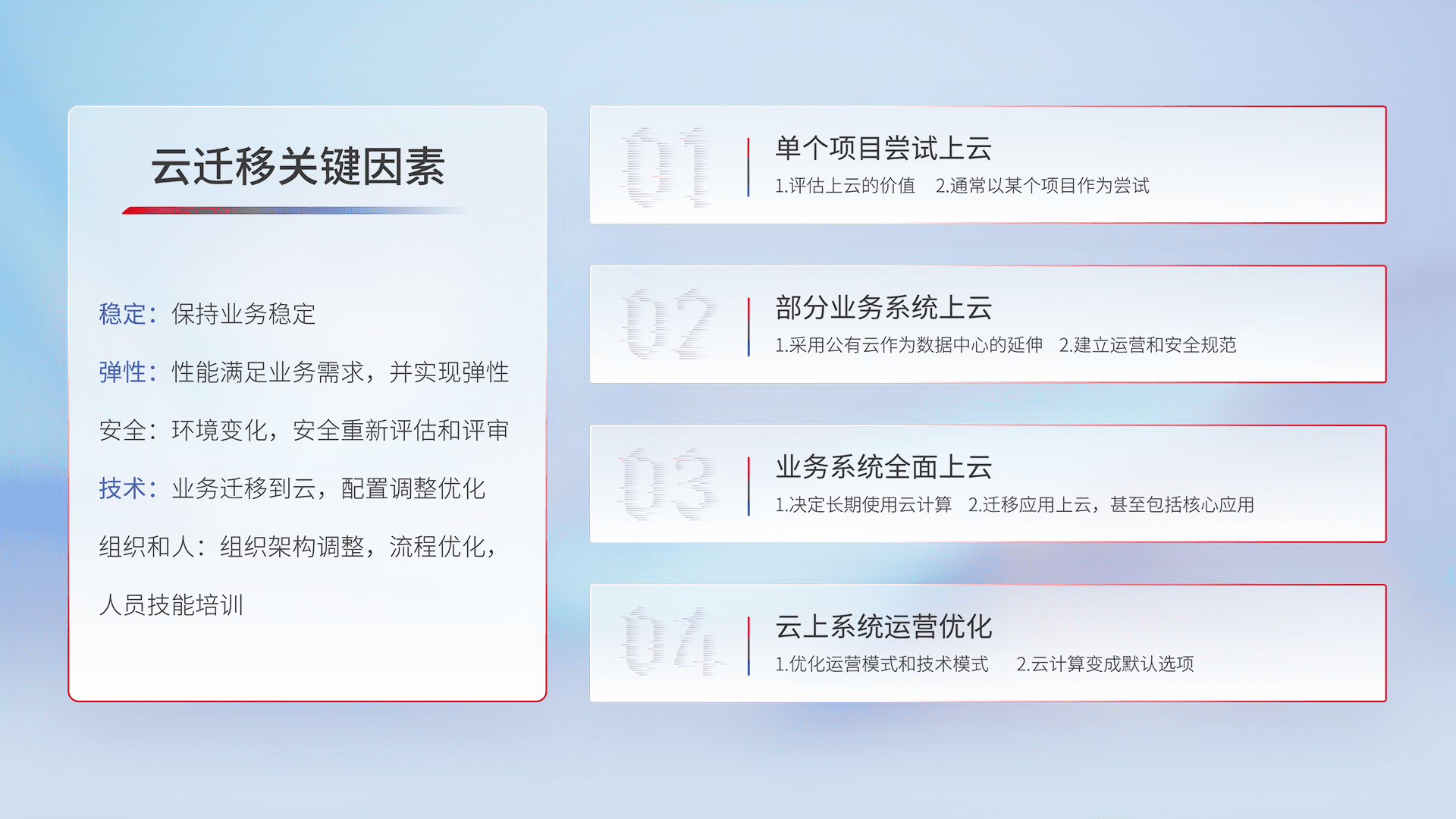结合实际业务,,从规划设计、、、、云平台选型、、、云原生改造、、、、数据迁移、、、、集成交付,,迁移全过程为客户识别最佳上云路径,,做好风险识别管理,,设计网络架构、、、、身份权限、、安全审计合规、、操作审计、、、、日志审计、、、、监控告警策略、、、、多站点容灾设计等,,,对云上基础设施进行整体规划,,,,提升IT治理水平,,以满足弹性、、高可用、、、、高性能的需求。。。