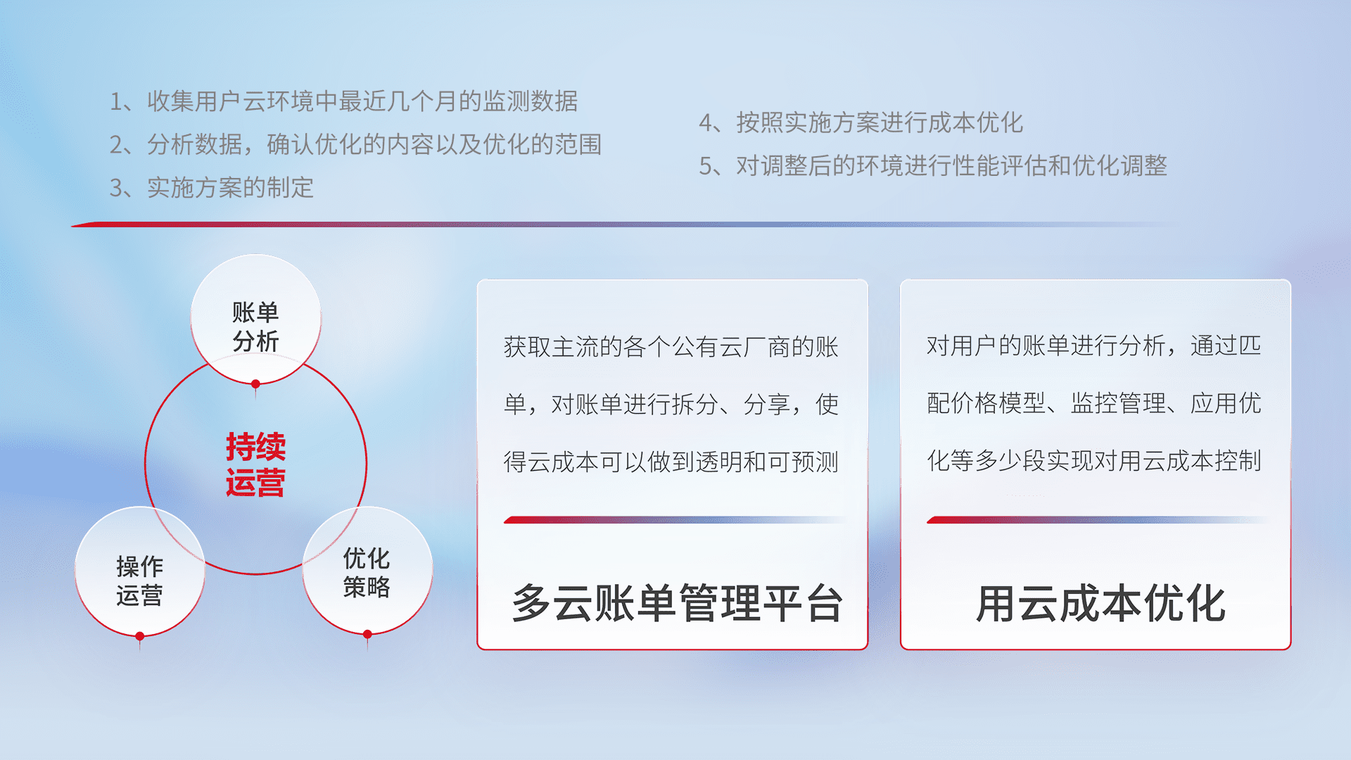通过多云纳管,,,,以统一的资源数据模型把客户的云资源进行抽象和封装,,,进而实现对多云资源的统一操作,,保障云资源管理的可靠性、、稳定性与可用性。。量身定制化运维内容,,,,配置、、、、开发运维、、、补丁管理、、、、备份、、、监控、、、认证和访问管理、、、、审计和日常巡检等,,保障在用云过程中的可靠度,,,稳定度以及高可用率。。。