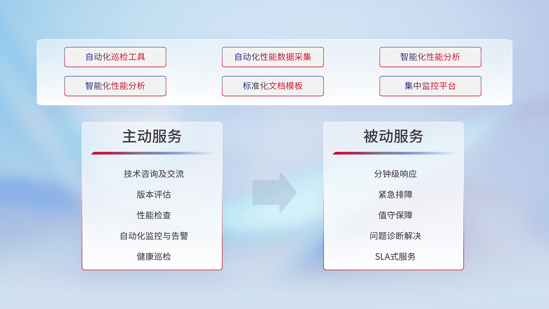 智能化工具和标准化文档,,保障服务质量,,提供主动服务(包含技术咨询、、版本评估、、、性能检查、、、、自动化监控与告警、、、健康巡检)和被动服务包含(分钟级响应、、、、紧急排障、、值守保障、、、问题诊断解决、、SLA服务)。。